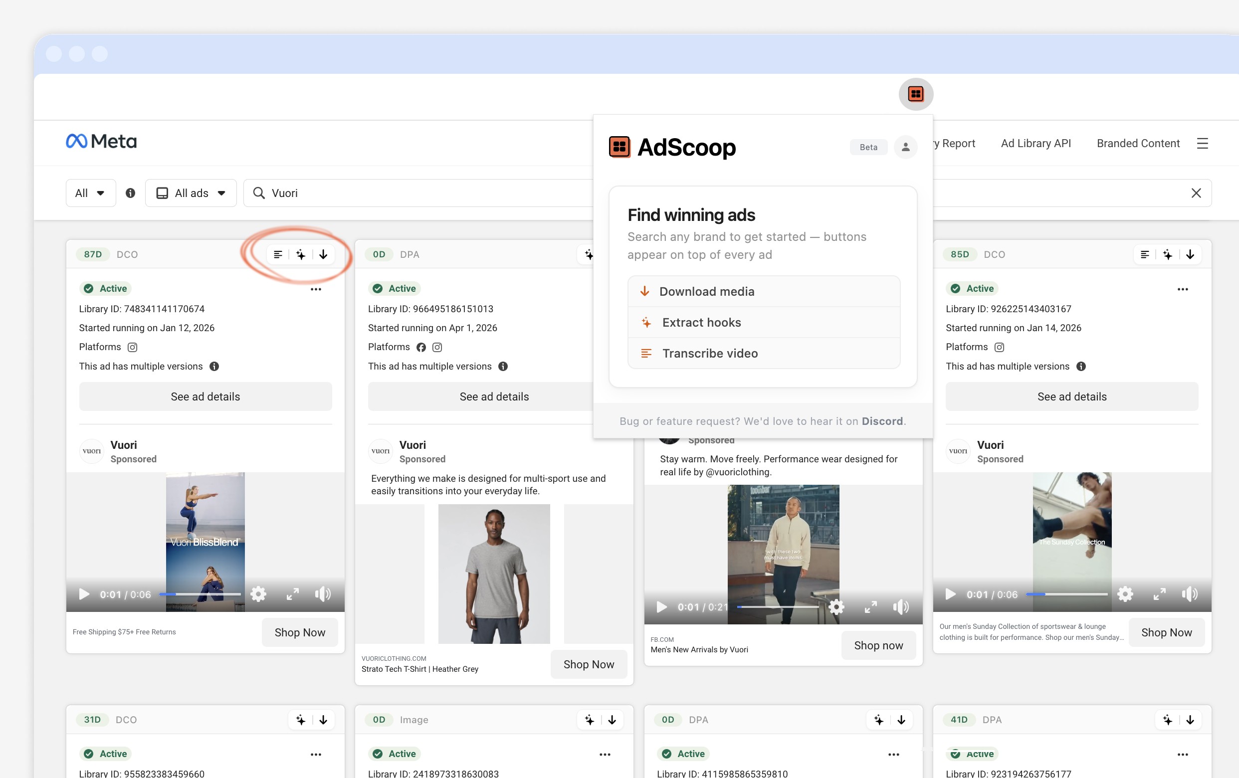 Download videos, images, and carousels right inside the Meta Ad Library — no new tabs, no extra tools. The fastest ad downloader built directly into the page, wherever you're browsing.