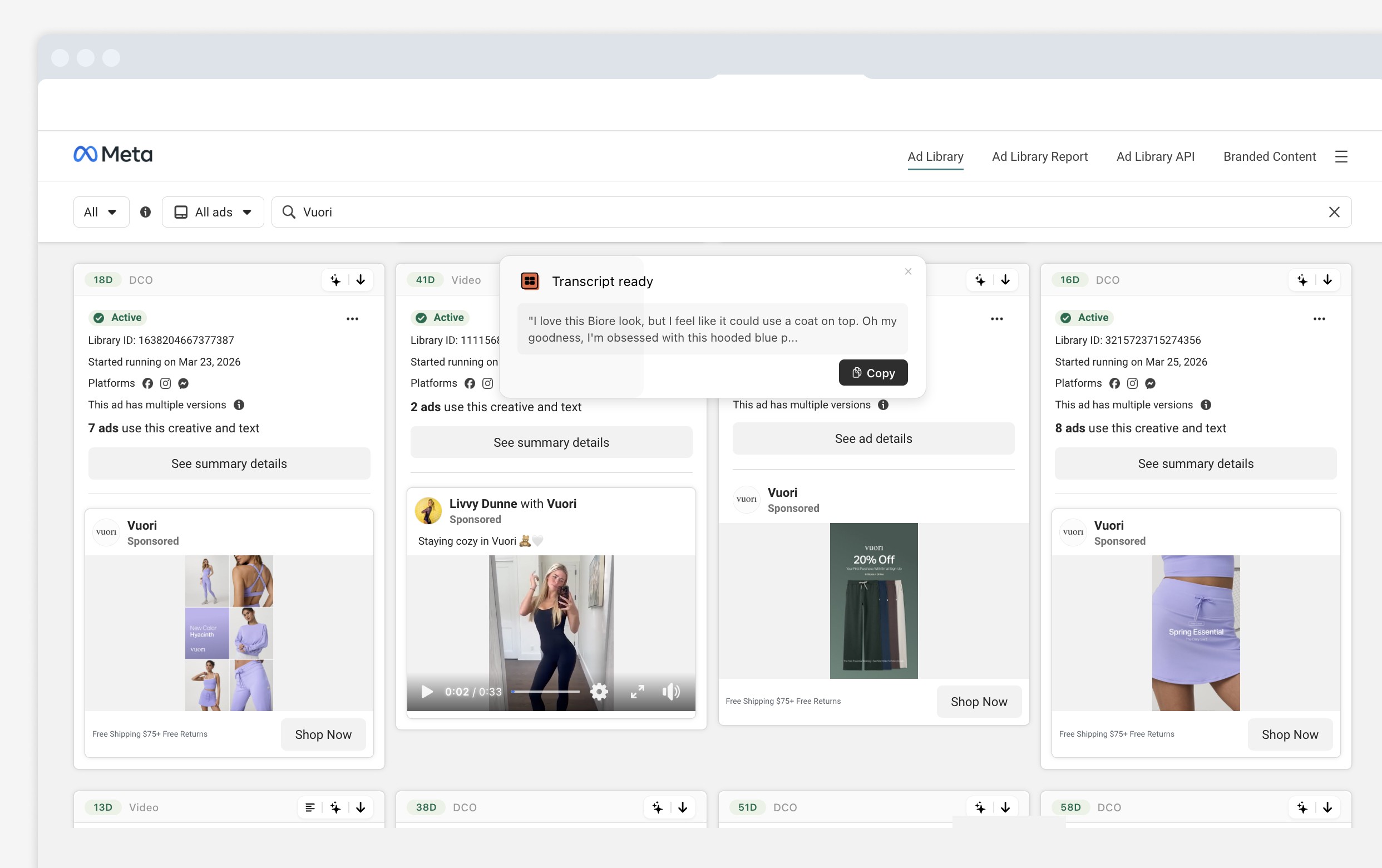 Every video ad, fully transcribed. See the complete script — so you can study what's being said, not just shown.